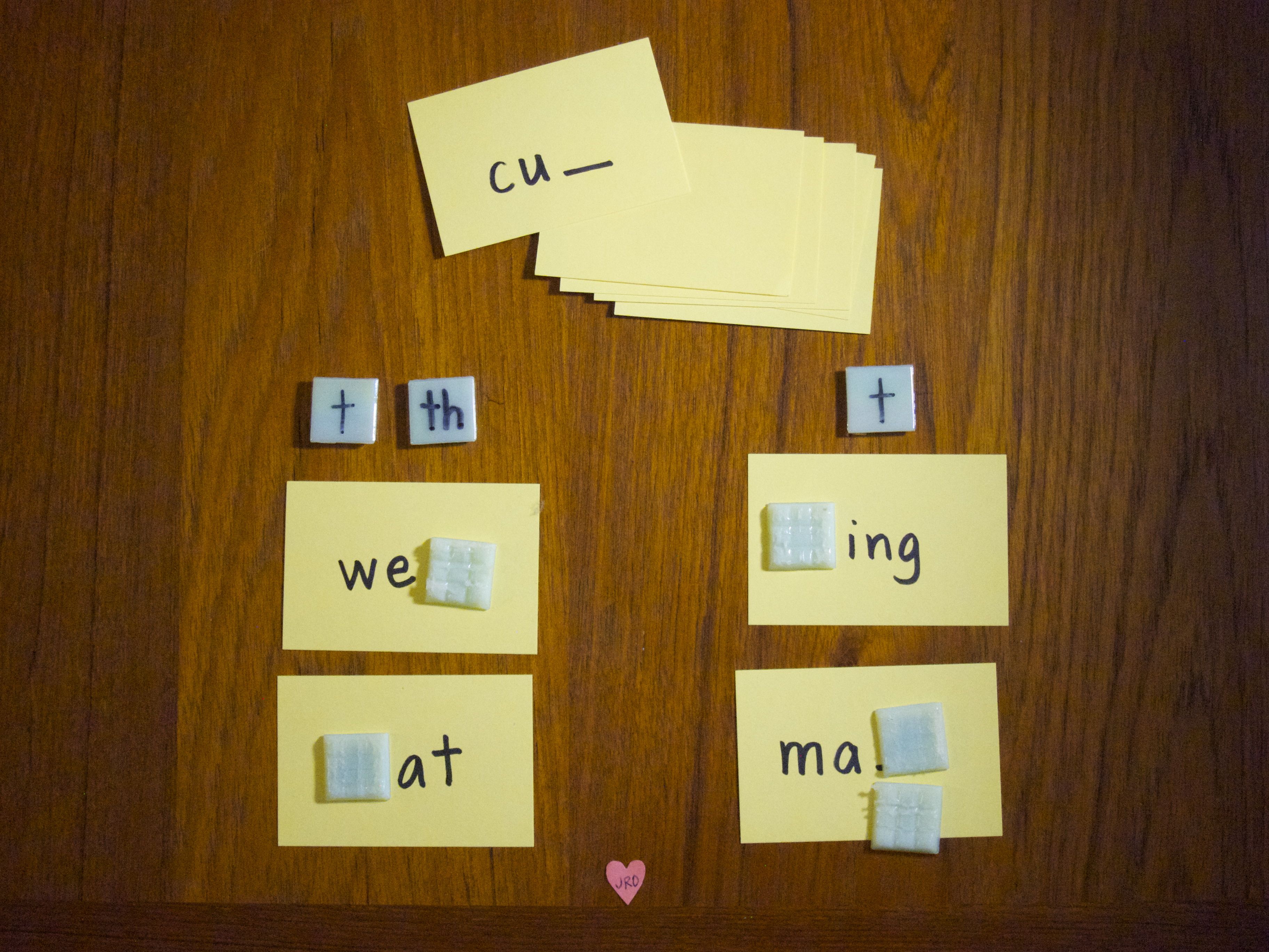 Two players compete to be the first to flip all 4 of their tiles. Each player is dealt a set of 4 tiles: 2 th tiles and 2 t tiles. There are 20 incomplete words in the deck of cards. The players take turns selecting a word card and flipping over the tile/s that correctly complete the word. Sometimes both a th and a t correctly complete a word, in which case 2 tiles can be flipped on one turn. And sometimes a player is forced to lose a turn because the remaining tile doesn’t work for their card. The first player with all 4 tiles flipped over is the winner. Flip It! is a very quick game which lends itself easily to short time slots or multiple rounds. It’s important to stress that the partners need to check each other on pronouncing the words and discerning whether or not they are real words in English.