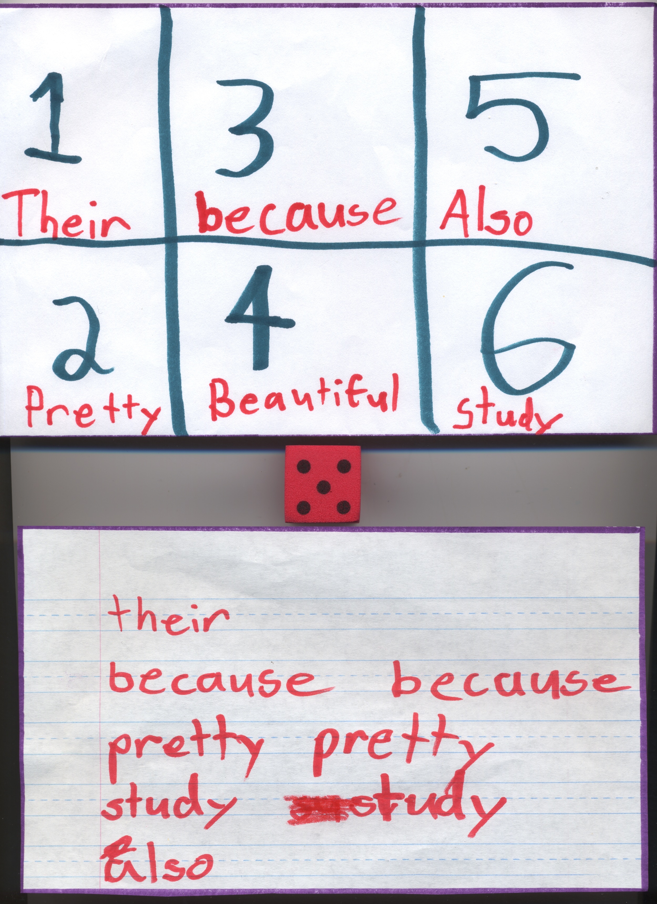 To prepare for this activity, the child makes a large square which then gets divided into sixths. Each sixth gets a number from 1 to 6 in it as well as one of the words to be practiced. Now the fun begins. The player rolls a die, sees which word is in that numbered square, and writes that word on the score sheet. What puts the pep in this activity is the use of a timer. You can use a three-minute salt timer from a game such as Boggle, or a kitchen timer or stopwatch which can be programmed for the amount of time that fits a particular child. When the time runs out, the child tallies the number of words s/he wrote; then in the next round, increasing that number becomes the goal. It’s important that the letters are said aloud as they’re written in order to open an auditory memory avenue to aid in retaining the spelling. This is a game of solitaire, though kids enjoy being at a table together when they play it.