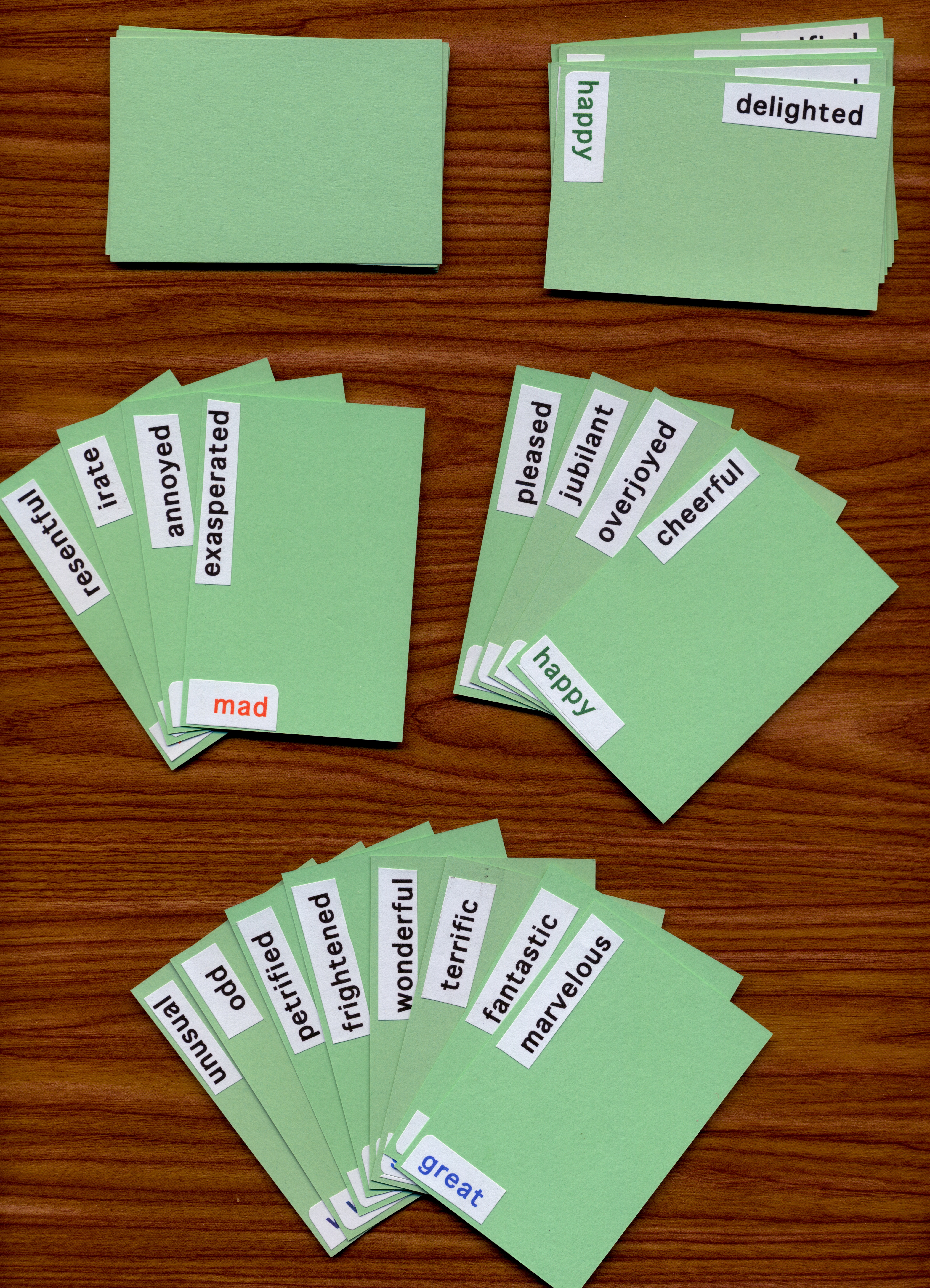 This game is for 2 players. Each player is dealt 8 cards. The remaining cards are placed down on the table, with the top card turned face up next to the pile. The object is to be the first player with 2 full families. A full family consists of 4 words within the same category of meaning. (See adjective list below.)