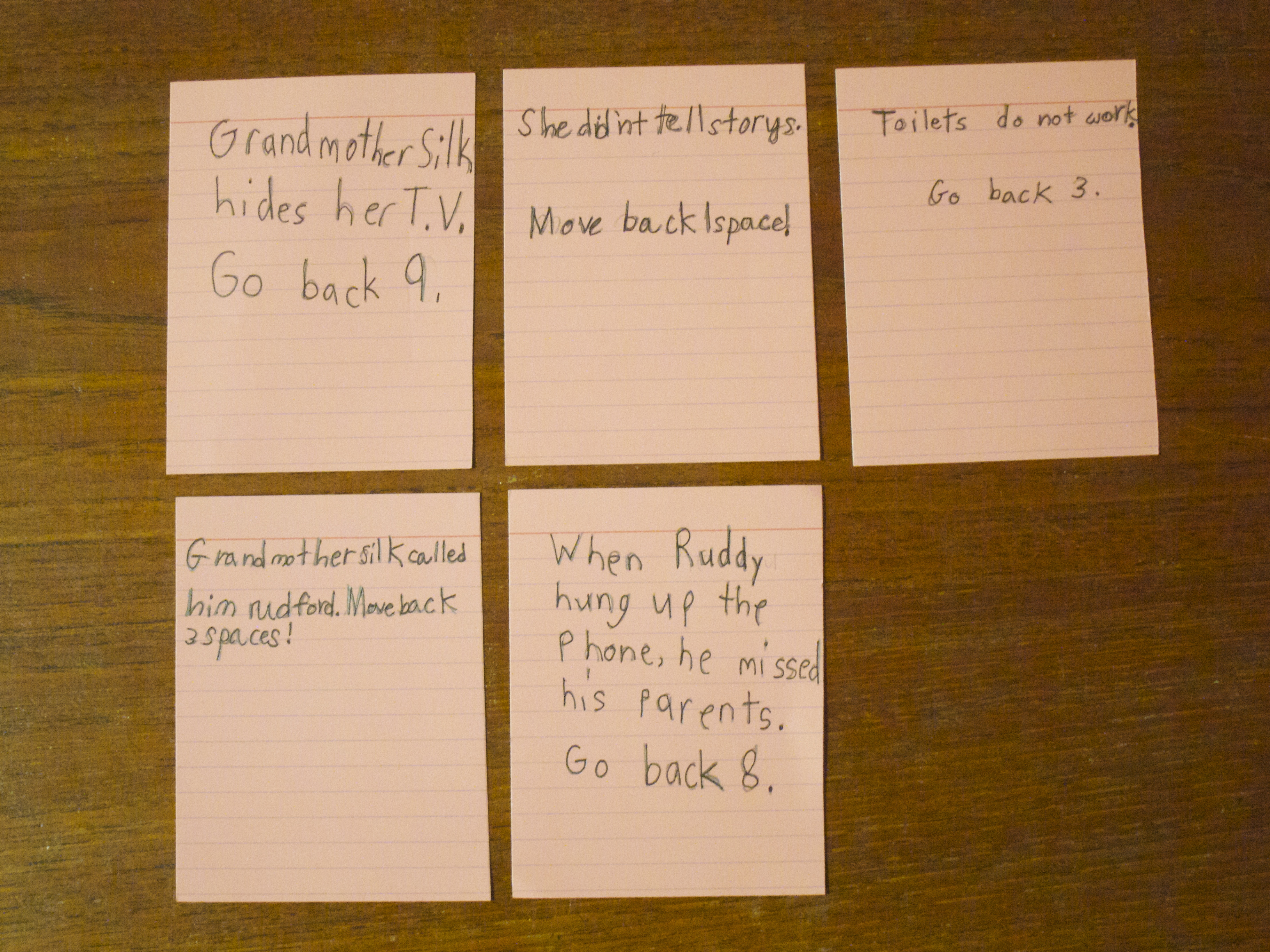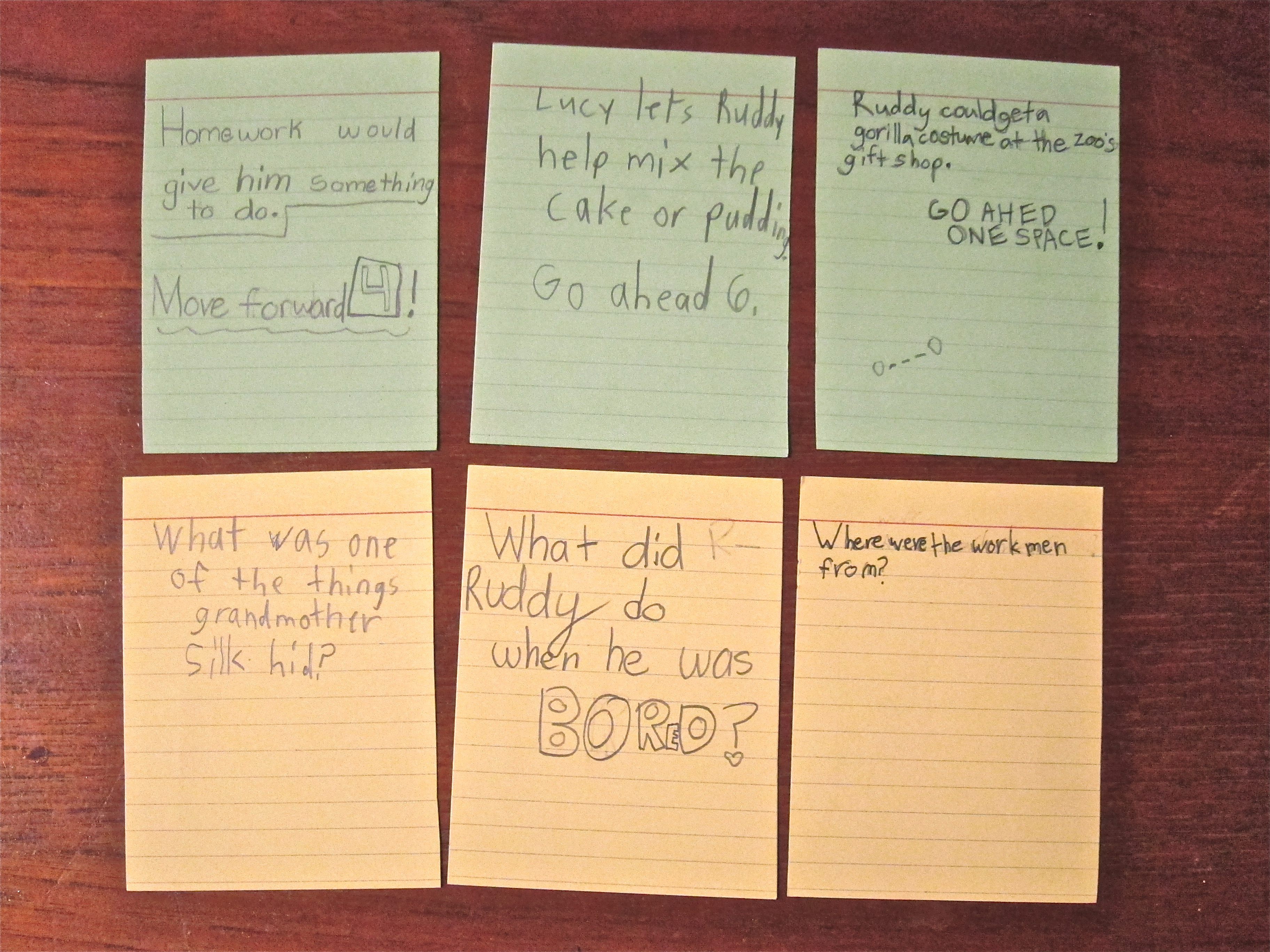 The students’ main job is to make happy, sad, and question cards for the game deck. To do this, they are given index cards to match the colors of the spaces on the board. In this example, the events that caused unhappiness in Ruddy, the main character, are on pink cards. The pink cards direct a player to go back a certain number of spaces. Conversely, green cards contain happy events and a directive to go ahead a number of spaces. Yellow cards are question cards. If a player answers the question correctly s/he rolls the dice again and moves forward. If not, s/he remains on the yellow space. During their reading of the book, my students have marked pages with smiley face and frowny face post-its, making it easy to pull details from the text when they get to the stage of creating game cards.