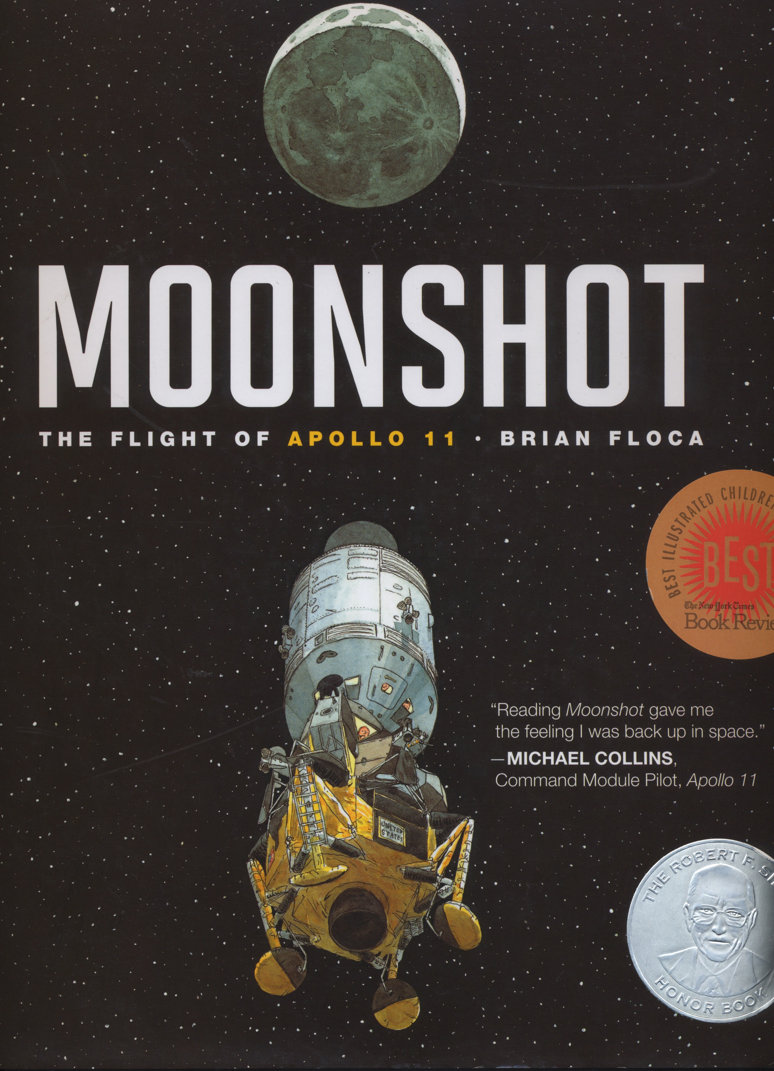 Moonshot is an earlier book by this year’s Caldecott winner, Brian Floca. It’s a compelling rendition of Apollo 11’s lunar landing portrayed in free verse and meticulously detailed illustrations.
